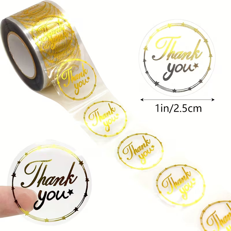 500 Pegatinas/Rollo Transparente con Foil Dorado, Etiquetas Adhesivas PVC de 1 Pulgada Redondas